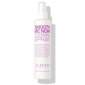 ELEVEN AUSTRALIA Smooth Me Now Thermal Spray to profesjonalny spray termoochronny, który skutecznie zabezpiecza włosy przed wysoką temperaturą narzędzi do stylizacji, takich jak prostownica, lokówka czy suszarka. Dzięki lekkiej formule nie obciąża pasm, a jednocześnie pomaga ujarzmić puszenie, wygładzając ich strukturę i nadając im zdrowy blask.