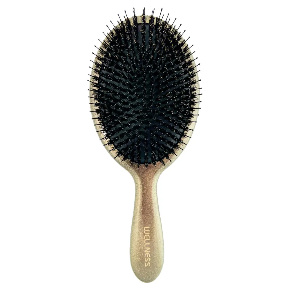 WELLNESS PREMIUM PRODUCTS Wellplex uniwersalna szczotka do włosów to praktyczne akcesorium stworzone do codziennej pielęgnacji włosów każdego rodzaju. Szczotka wykonana została z połączenia naturalnego włosia dzika oraz elastycznych końcówek nylonowych, które ułatwiają rozczesywanie włosów i wygładzanie ich struktury. Naturalne włosie pomaga rozprowadzać sebum na długości włosów, dzięki czemu pasma stają się bardziej lśniące i zadbane. Nylonowe kolce skutecznie rozplątują włosy bez ich nadmiernego szarpania. Podczas czesania szczotka delikatnie masuje skórę głowy, wspierając mikrokrążenie. Solidna konstrukcja oraz ergonomiczny uchwyt zapewniają wygodę codziennego użytkowania.